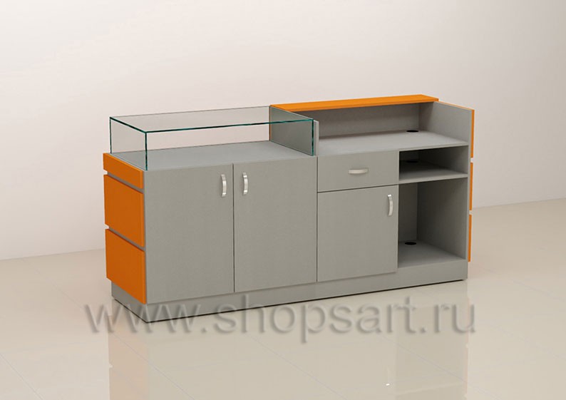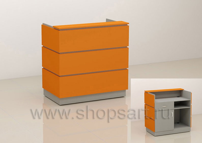 Кассовый стол состоит из 2-х составных элементов, соединенных между собой в единое изделие. Изготовлен из ЛДСП серого цвета и суперглянецевого МДФ или матового ЛДСП оранжевого цвета. Кассовый блок может иметь любое внутреннее наполнение: полки, дверки с замками, шкафчики и ящики. Зона прилавка для выкладки сопутствующих товаров открыта со стороны продавца и удобна, как для продавца, так и для покупателя.