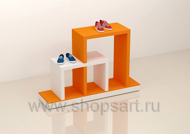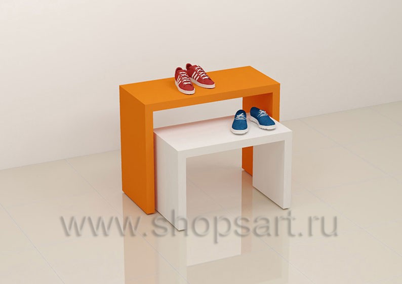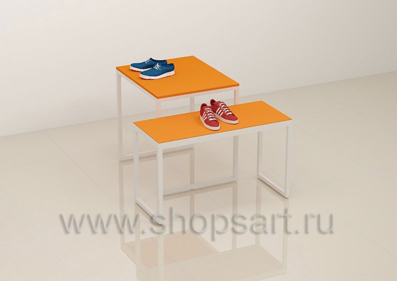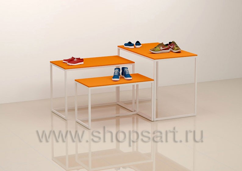 Комплект демонстрационных островных столиков является хорошим решением для выкладки обуви или трикотажа для магазина спортивных товаров. Столики устанавливают в центре магазина или рядом с входной группой, являются полезным элементом, который дополнит любое торговое пространство. Демонстрационные столики могут переставляться между собой и задвигаться друг друга. Изготавливаются в любых размерах.