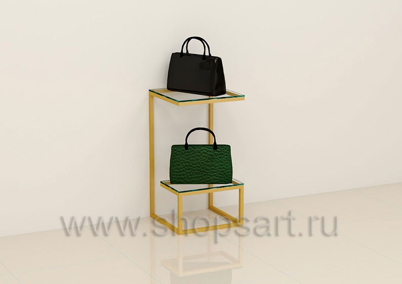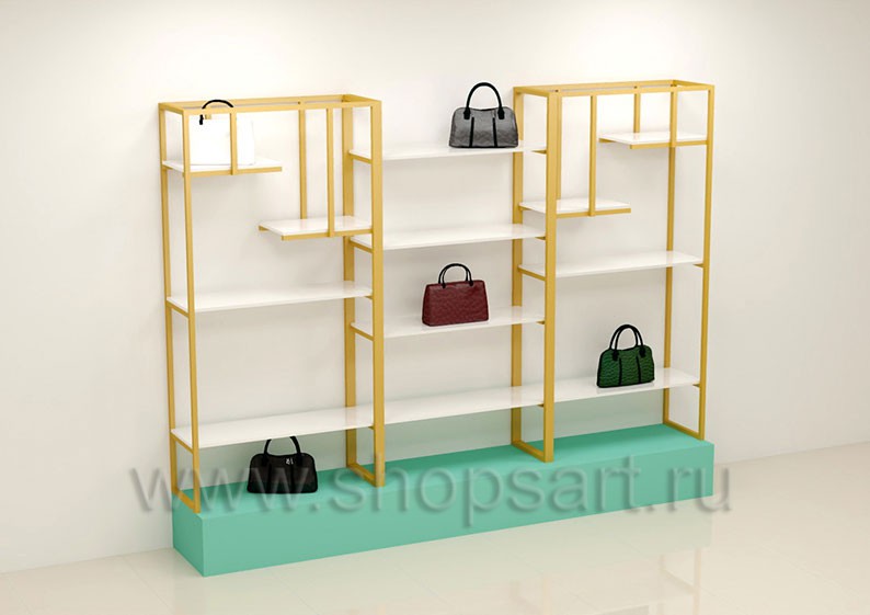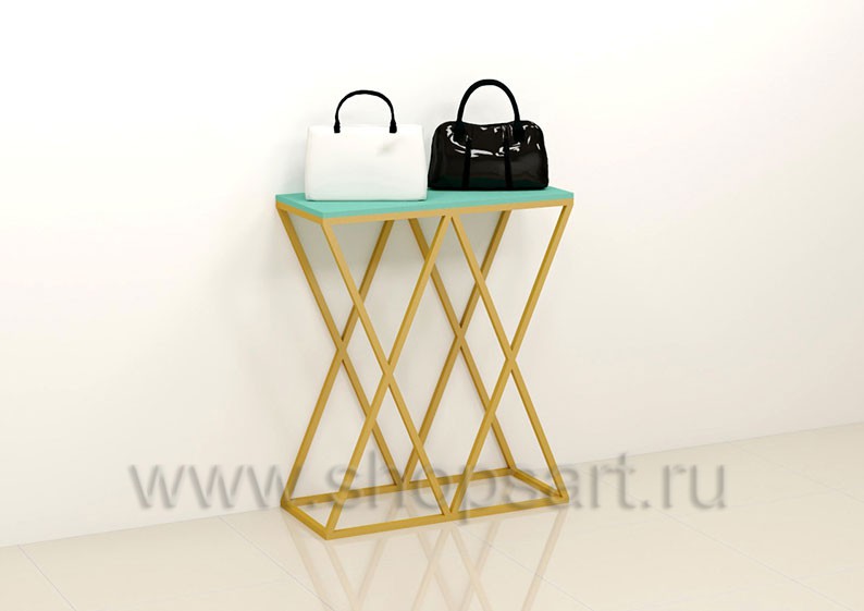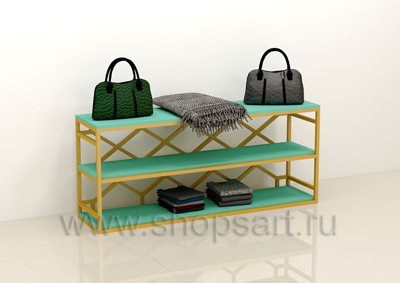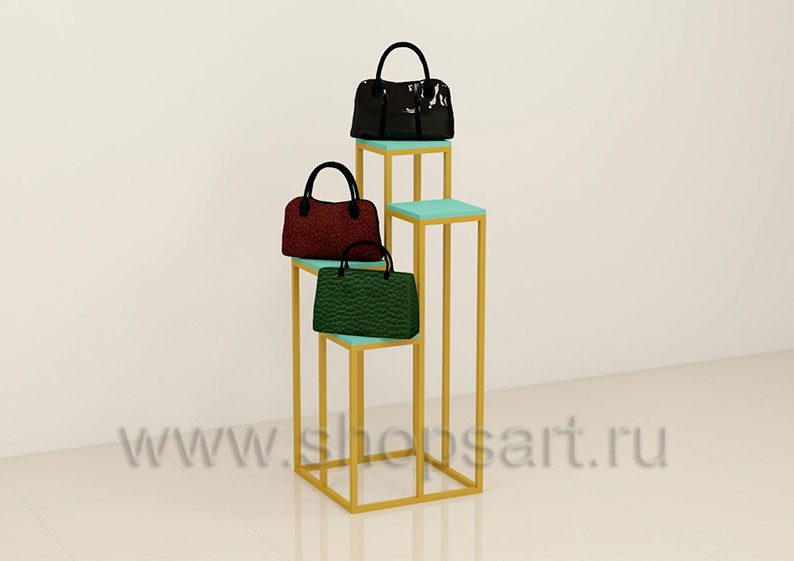 Стойка торговая, для демонстрации сумок, предназначена для оформления торговых витрин, подойдет для создания островных и пристенных конструкций в зале магазина, выставочного павильона или бутика. Каркас изготавливается из цельносварной металлической, квадратной трубы 25X25 мм, с покрытием порошковой краской золотого, матового цвета. Полочка выполнена из МДФ покрытого матовой эмалью цвет «тиффани».