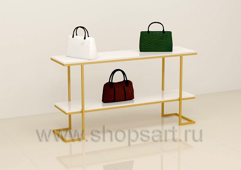 Торговый стол предназначен для демонстрации сумок, дополнит интерьер любого, торгового помещения, поможет создать эксклюзивные островные конструкции в магазине или бутике небольшой площади. Каркас демонстрационного стола имеет цельносварную металлическую конструкцию, выполненную из квадратной трубы 25х25 мм с покрытием порошковой краской золотого, матового цвета. Полки выполнены из МДФ покрытого белой, матовой эмалью.