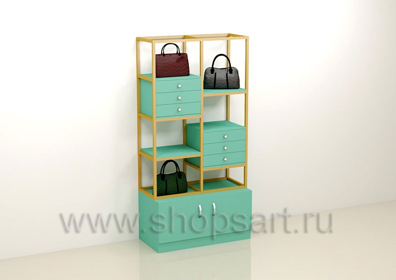 Стеллаж пристенный предназначен для демонстрации сумок и аксессуаров. Торговый стеллаж состоит из открытой конструкции с полочками для демонстрации товара, укомплектован выдвижными ящиками и накопителем с распашными дверками для хранения и сортировки товара. Каркас изделия выполнен из цельносварной металлической квадратной трубы 25х25 мм, с покрытием порошковой краской золотого, матового цвета. Полочки, выдвижные ящики и накопитель выполнены из МДФ с покрытием матовой эмалью, цвет «тиффани».
