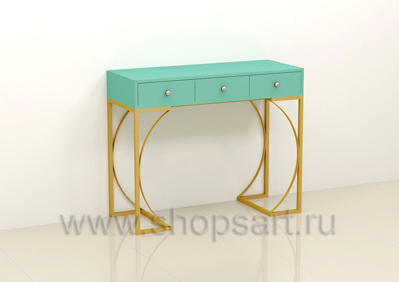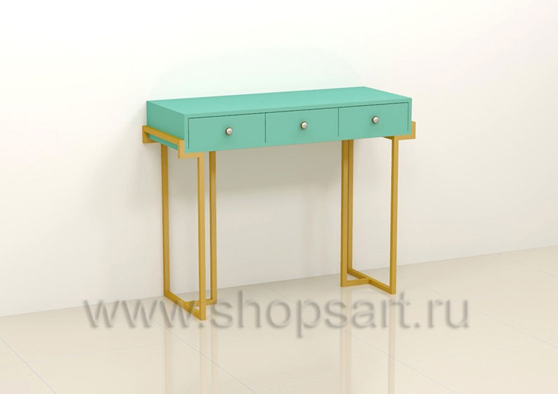 Торговый стол предназначен для демонстрации сумок и аксессуаров, подойдет для оформления торговых пристенных конструкций в магазине или бутике. Конструкция демонстрационного стола оснащена компактными тремя ящиками, с системой нажатия, для хранения товарных запасов и столешницей для выкладки товара. Каркас стола выполнен из квадратной трубы 25×25 мм c покрытием порошковой краской золотого, матового цвета. Столешница с выдвижными ящиками выполнена из МДФ, покрытого матовой эмалью цвет «тиффани».