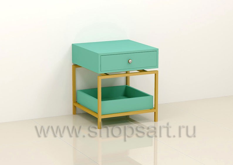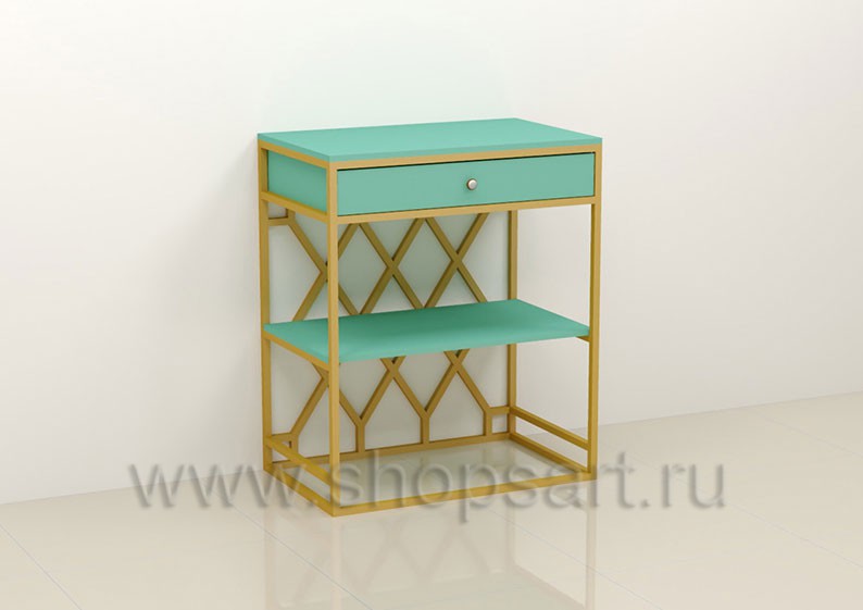 Тумба дополнит интерьер любого магазина или бутика, укомплектована выдвижным ящиком для хранения мелких товарных запасов или буклетов. Подойдет для демонстрации товара или оформления гостевой зоны. Каркас изделия выполнен из сварной металлической трубы с покрытием порошковой краской золотого, матового цвета. Полочка и выдвижной ящик выполнены из МДФ покрытого матовой эмалью, цвет «тиффани».