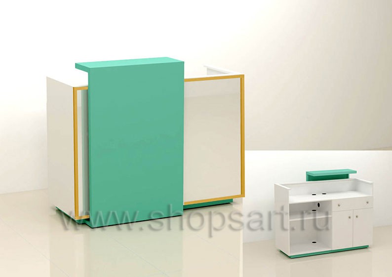Кассовый стол состоит из рабочего места кассира или продавца. Изделие выполнено из МДФ покрытого матовой эмалью белого цвета. Декоративная накладка изготовлена также из МДФ с покрытием матовой эмалью, цвет «тиффани», на которую может быть нанесено торговое название компании. Внутреннее наполнение кассового стола имеет открытую конструкцию с полочками, ящиком и дверками, запирающимися на ключ.